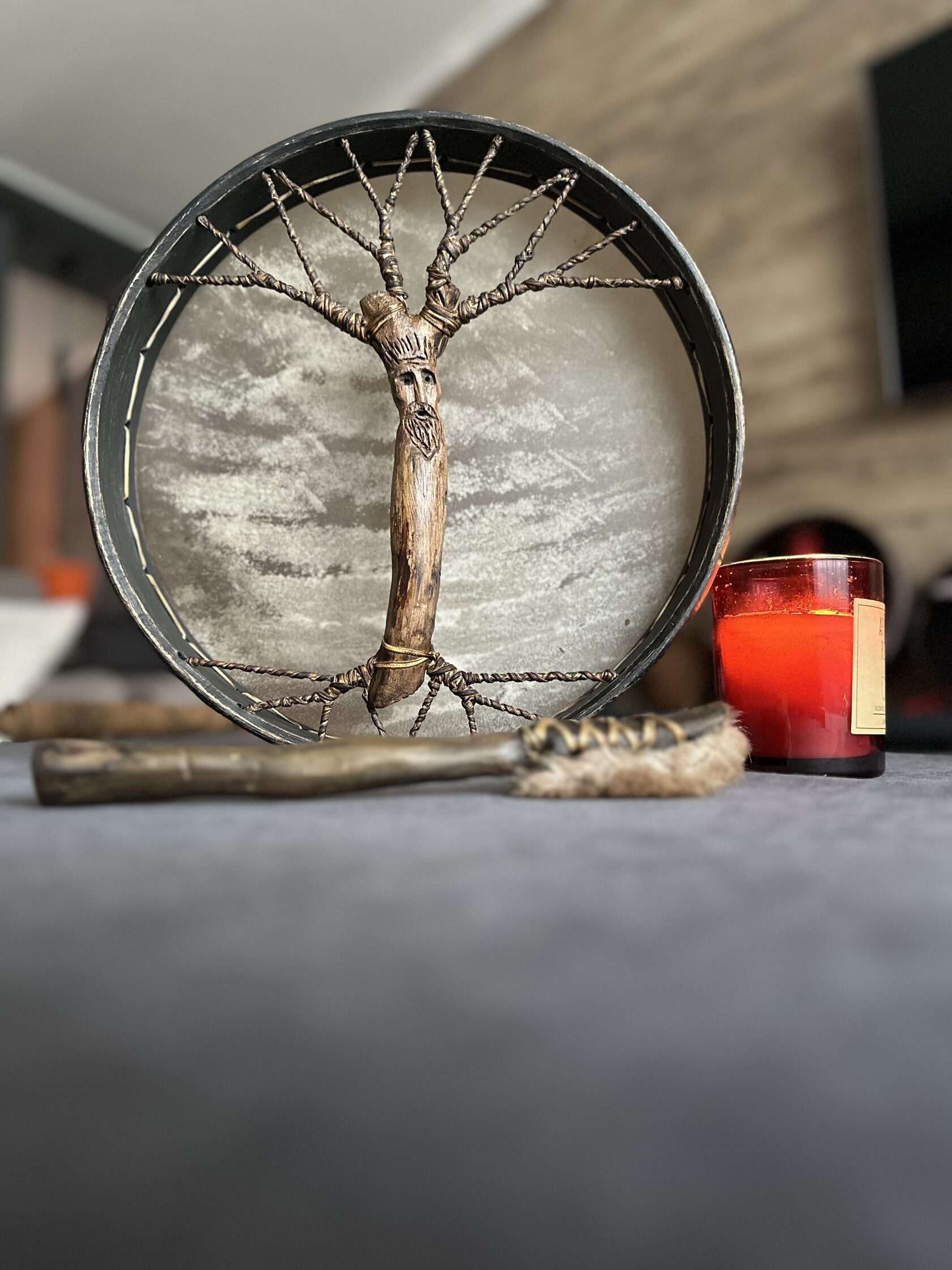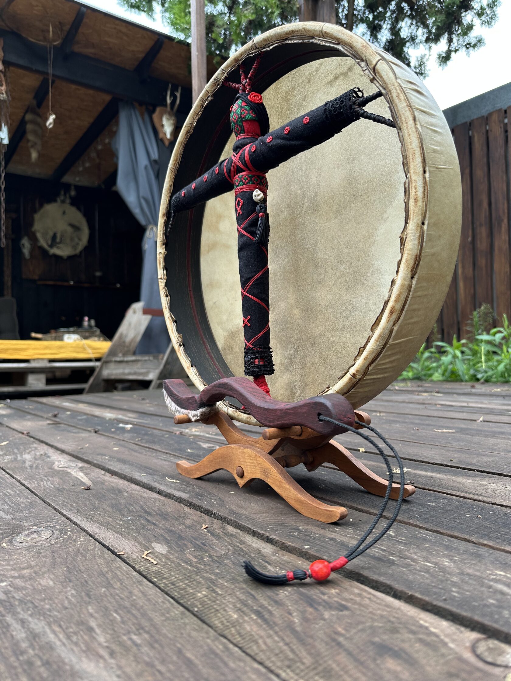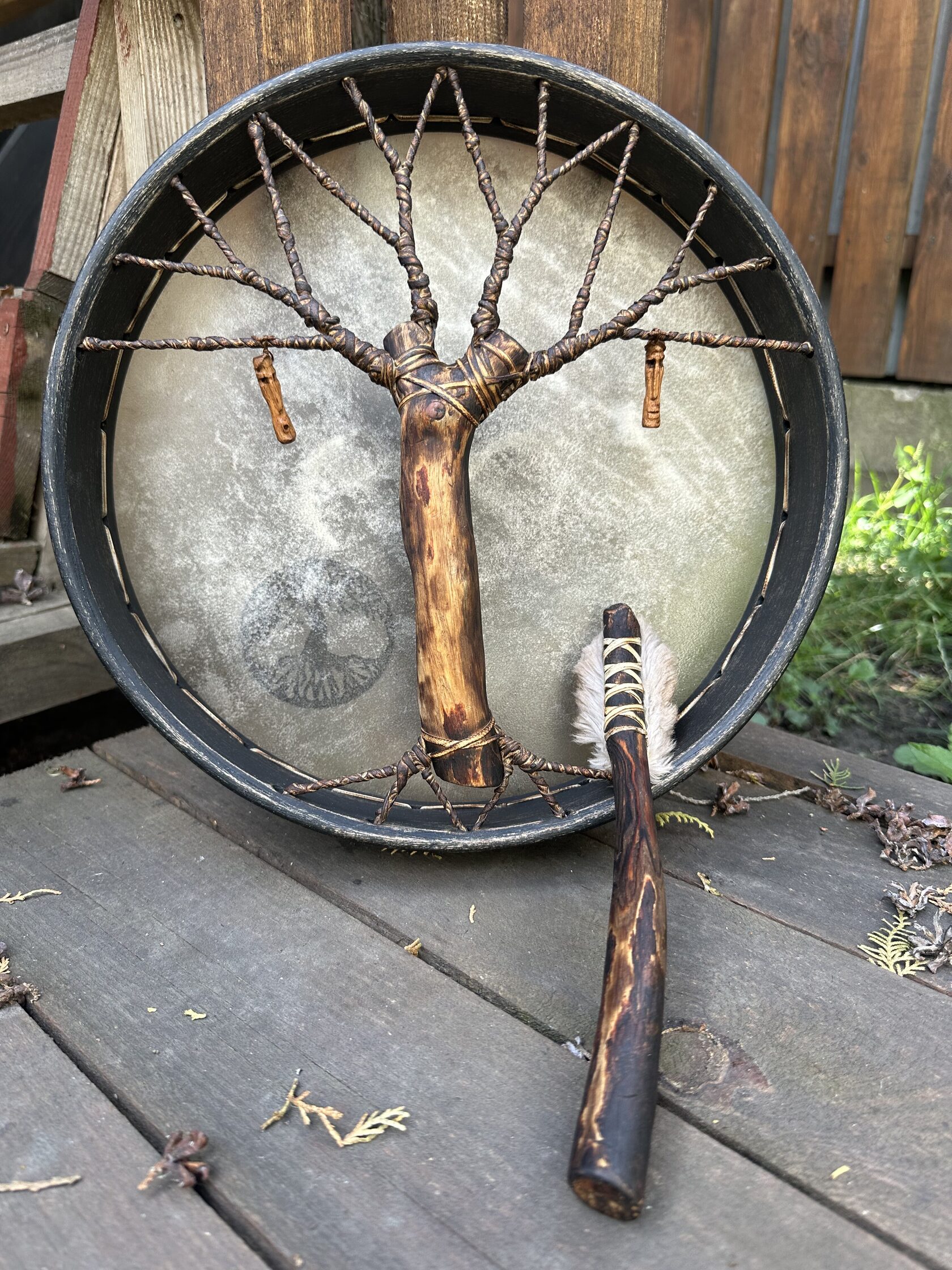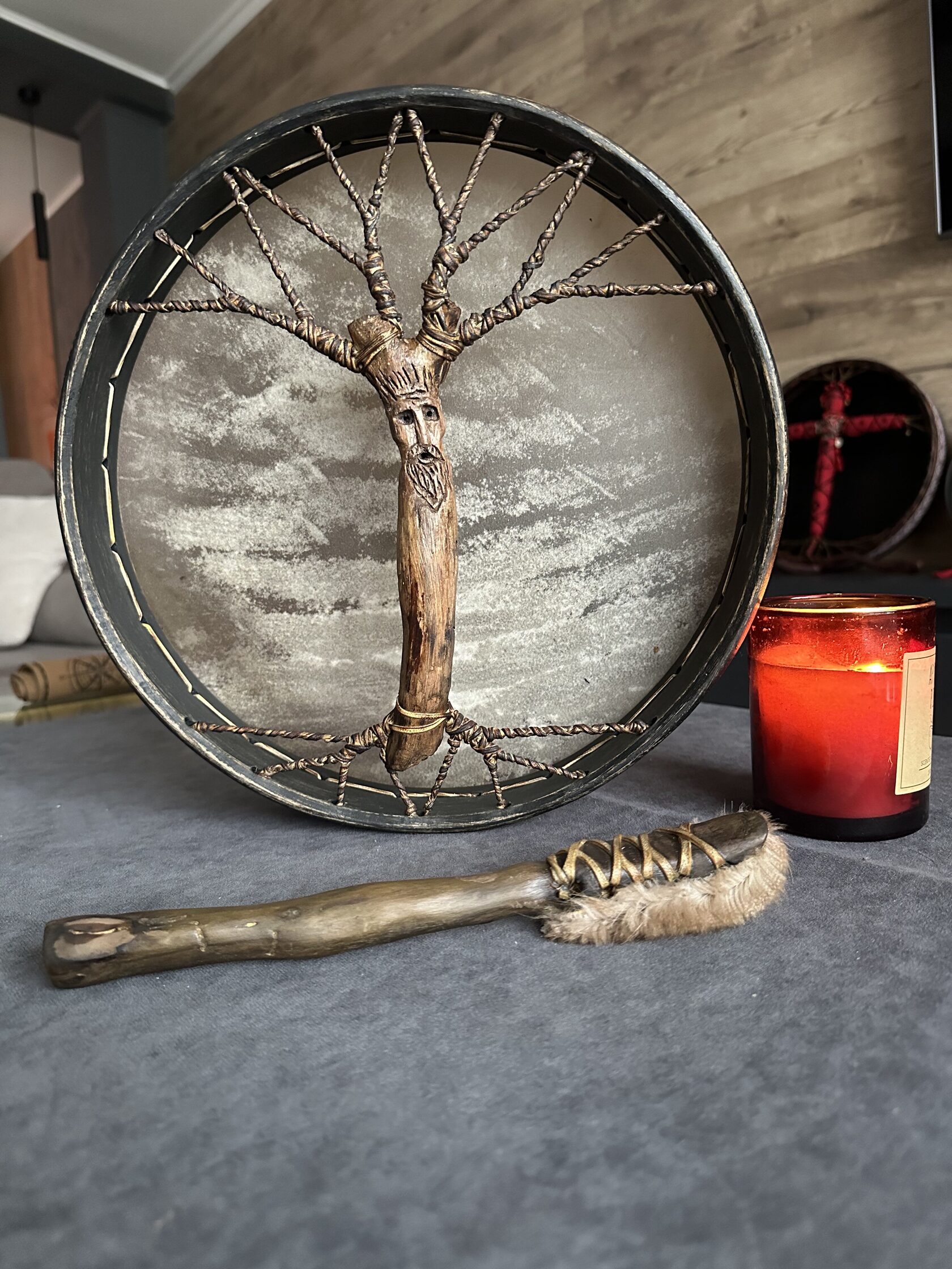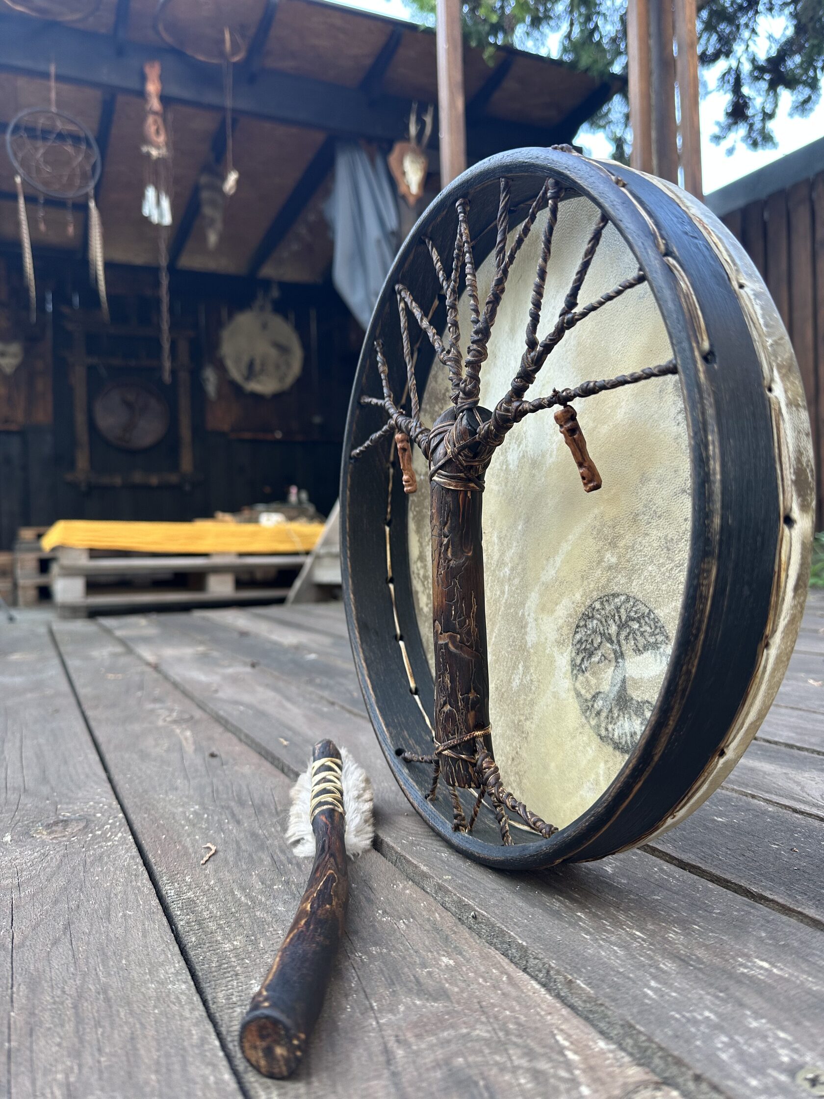 | Про мене Привіт. Мене звати Макс, і моя історія з бубнами почалася у 2015 році. Тоді я вперше вирішив зробити бубон для себе — так з’явилося хобі, яке з часом перетворилося на справу життя. У 2018 році я зробив сміливий вибір: після 18 років у великій компанії залишив офісну роботу, щоб присвятити себе ремеслу. Відтоді створення шаманських бубнів стало моєю професією та покликанням. За понад 10 років я виготовив більше двох тисяч бубнів, і сьогодні вони звучать у багатьох країнах світу. Завдяки багаторічній практиці та наполегливій роботі мені вдалося виробити власний підхід до створення інструментів. Саме тому кожен бубон має глибокий і насичений низький звук, який відчувається всім тілом. Це результат досвіду, який приходить лише з роками кропіткої праці. Окрему увагу я приділяю рукояткам: від символічних «Дерев життя» до складних різьблених фігур, створених вручну. Кожна рукоятка несе власний образ і сенс, роблячи інструмент неповторним. Я працюю лише з натуральними матеріалами: козячою шкірою для мембран, ясеневим деревом для ободів, сосною та вільхою для рукояток і колотушок. У декорі використовую метал, каміння, бісер, льон та інші природні матеріали, щоб надати кожному виробу завершеного образу й особливої сили. Кожен виріб народжується в моїй майстерні виключно вручну, має свій характер і допомагає власнику відкрити внутрішній ритм та силу. |