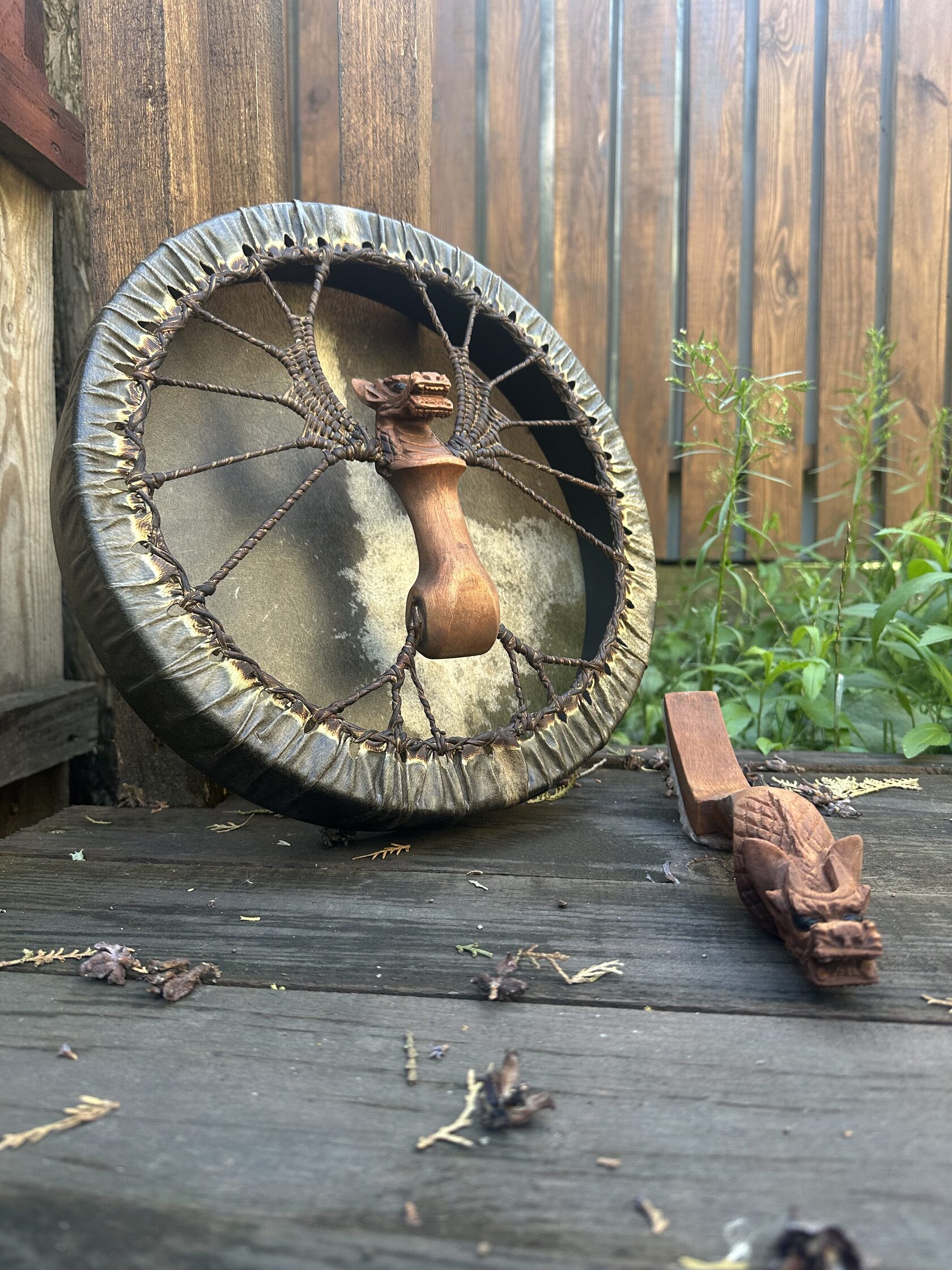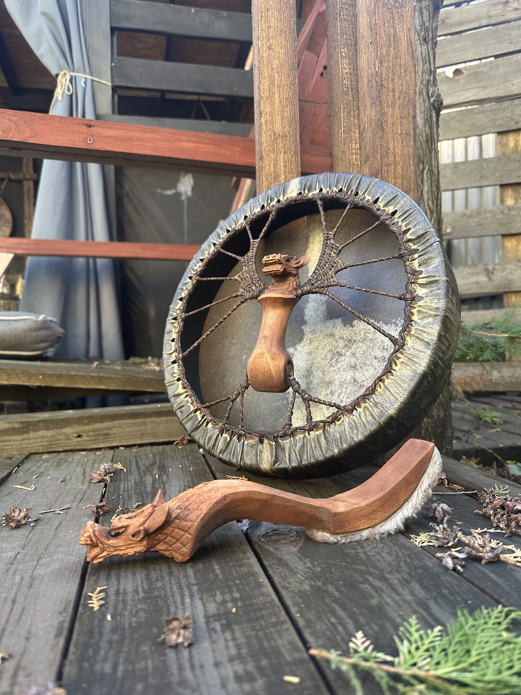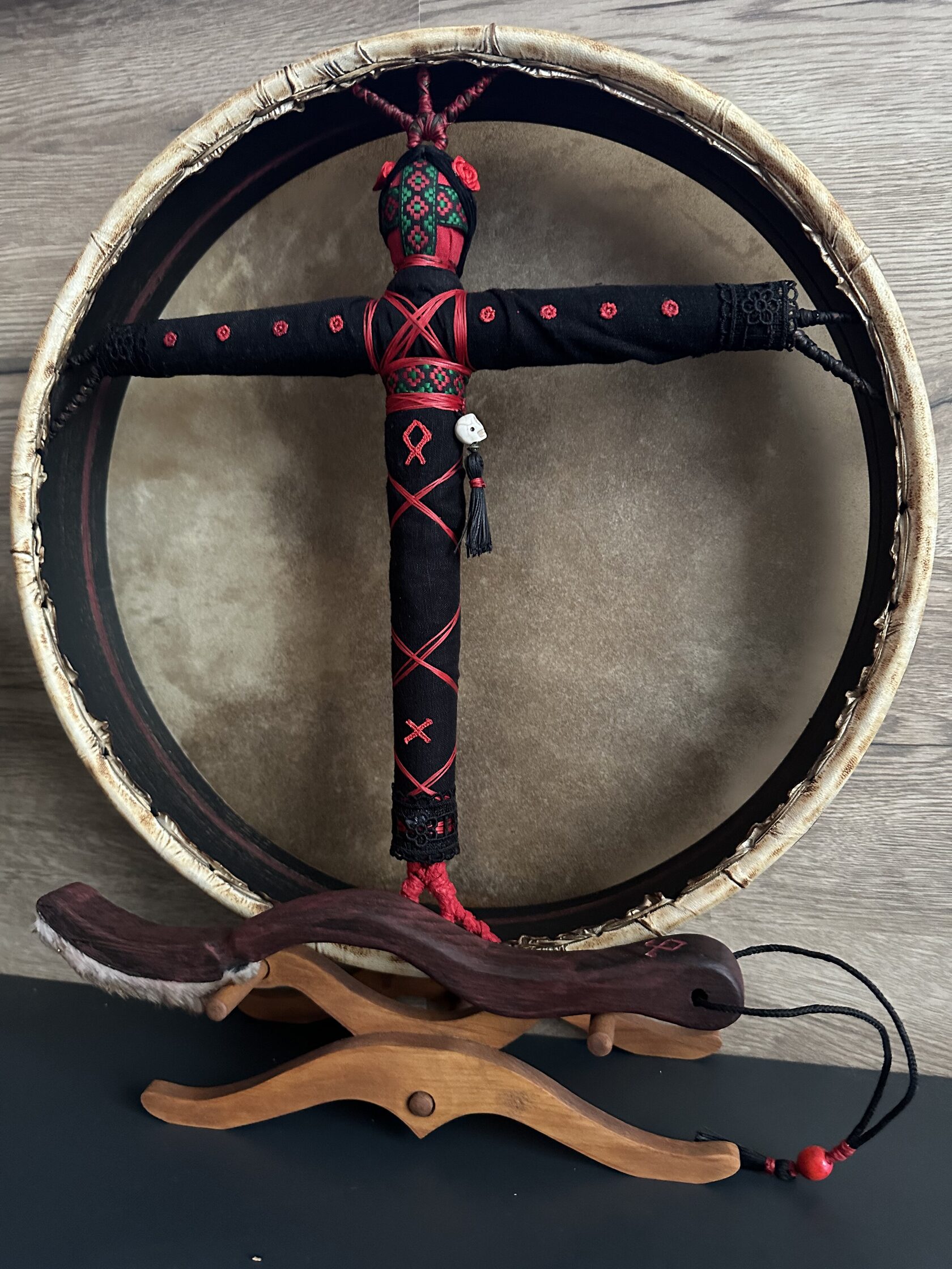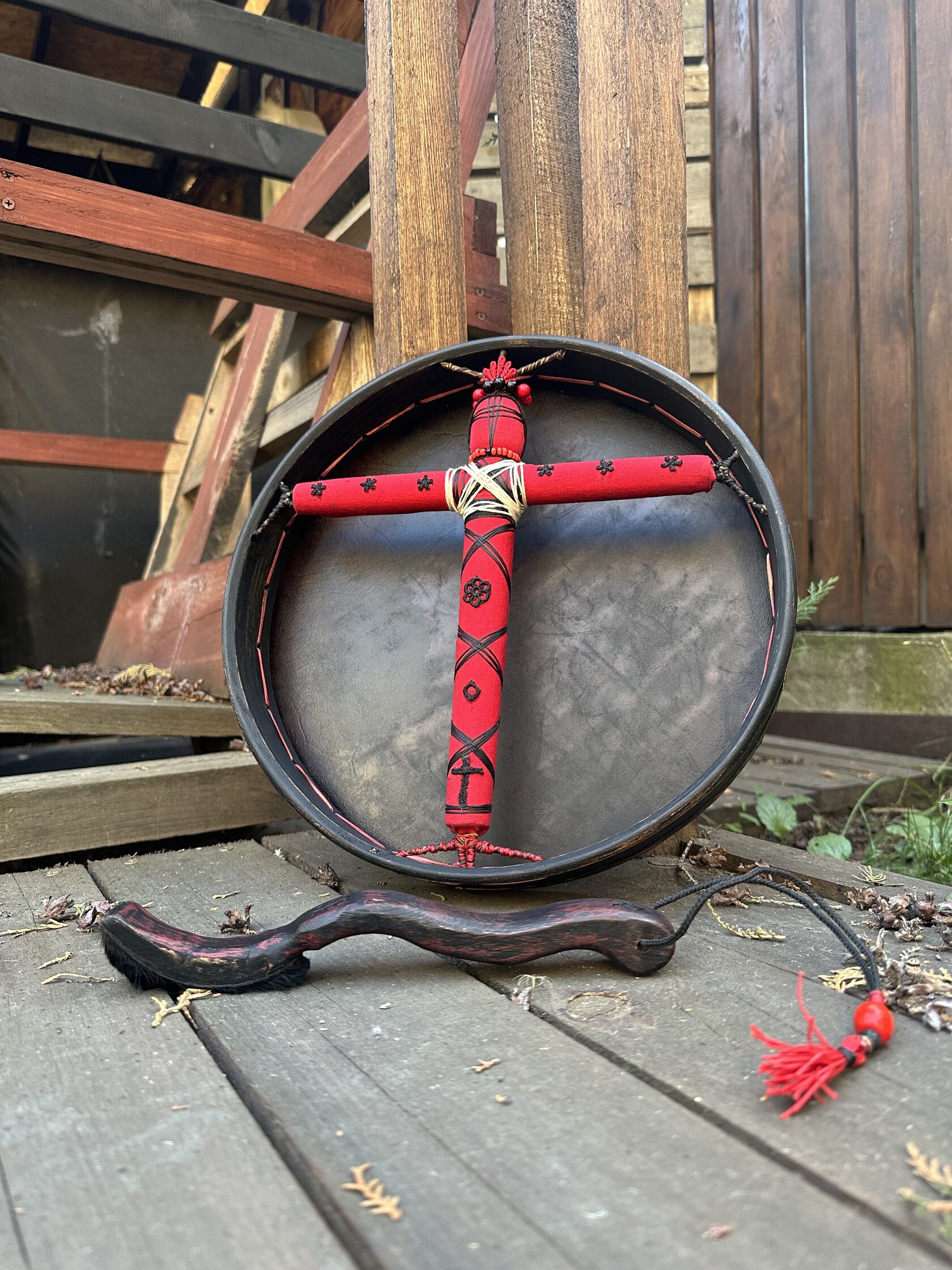 | Про мене Привіт. Мене звати Макс, і моя історія з бубнами почалася у 2015 році. Тоді я вперше вирішив зробити бубон для себе — так з’явилося хобі, яке з часом перетворилося на справу життя. У 2018 році я зробив сміливий вибір: після 18 років у великій компанії залишив офісну роботу, щоб присвятити себе ремеслу. Відтоді створення шаманських бубнів стало моєю професією та покликанням. За понад 10 років я виготовив більше двох тисяч бубнів, і сьогодні вони звучать у багатьох країнах світу. Завдяки багаторічній практиці та наполегливій роботі мені вдалося виробити власний підхід до створення інструментів. Саме тому кожен бубон має глибокий і насичений низький звук, який відчувається всім тілом. Це результат досвіду, який приходить лише з роками кропіткої праці. Окрему увагу я приділяю рукояткам: від символічних «Дерев життя» до складних різьблених фігур, створених вручну. Кожна рукоятка несе власний образ і сенс, роблячи інструмент неповторним. Я працюю лише з натуральними матеріалами: козячою шкірою для мембран, ясеневим деревом для ободів, сосною та вільхою для рукояток і колотушок. У декорі використовую метал, каміння, бісер, льон та інші природні матеріали, щоб надати кожному виробу завершеного образу й особливої сили. Кожен виріб народжується в моїй майстерні виключно вручну, має свій характер і допомагає власнику відкрити внутрішній ритм та силу. |