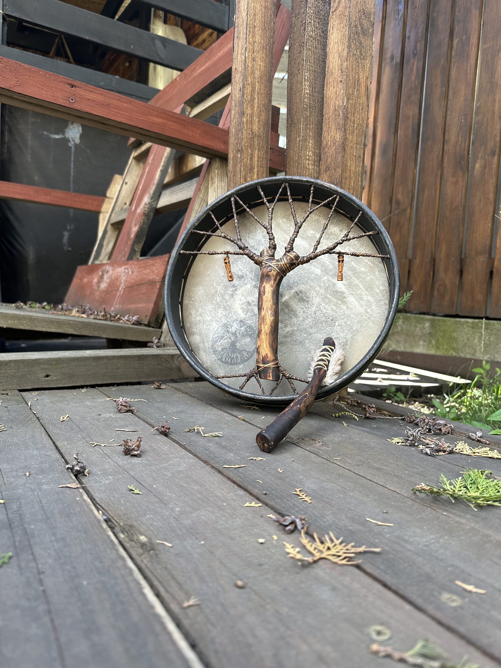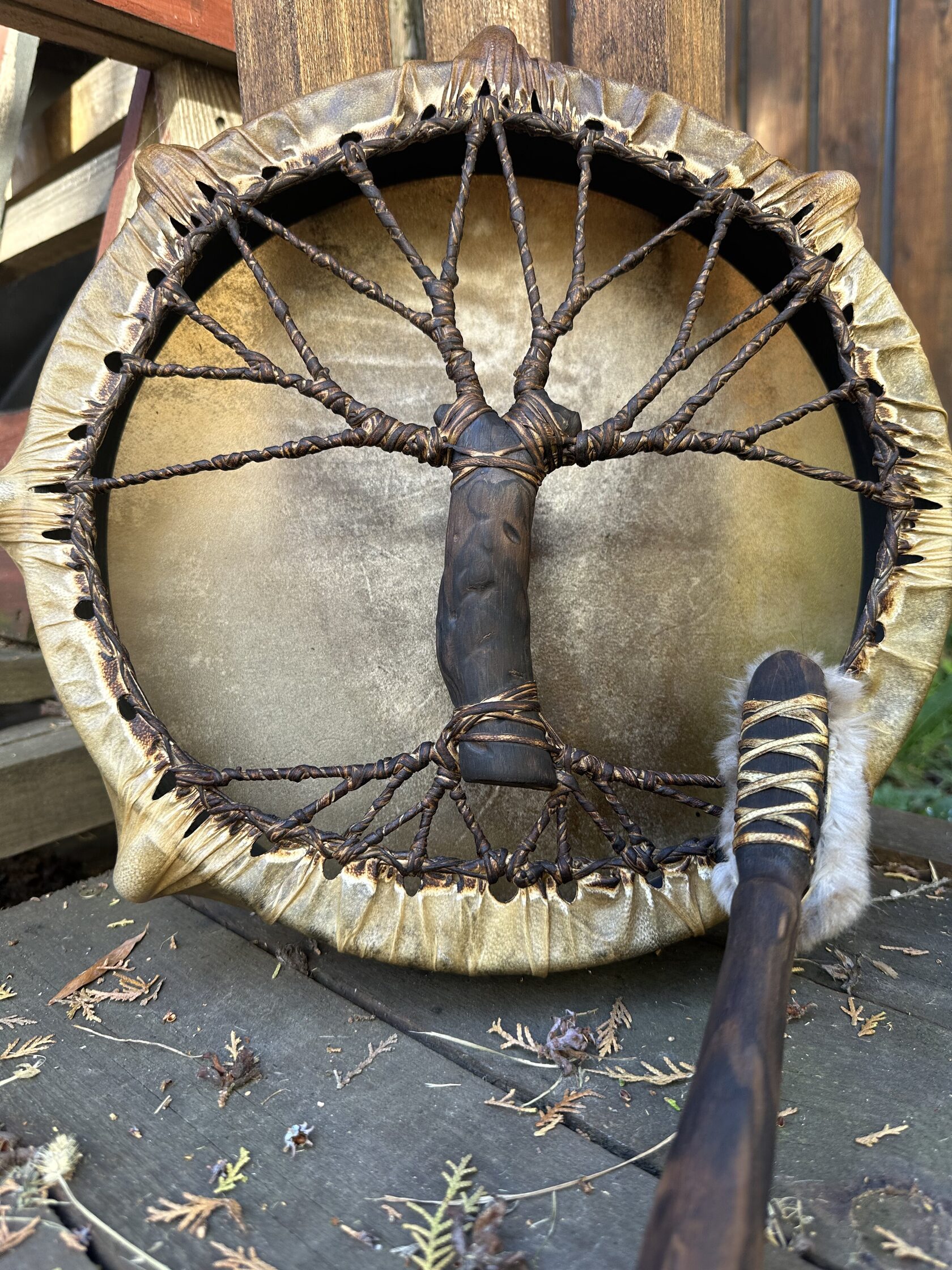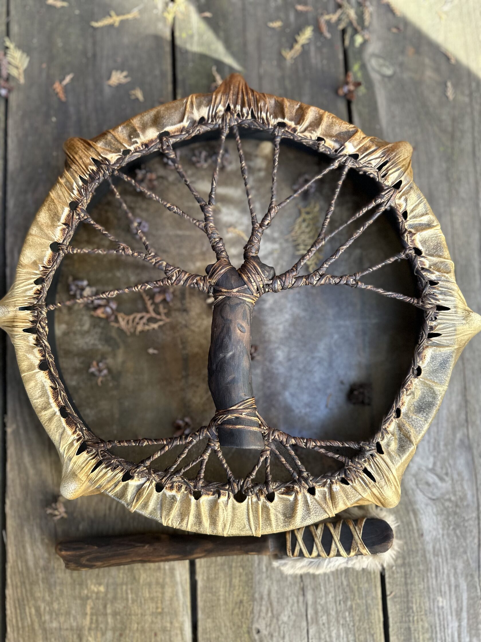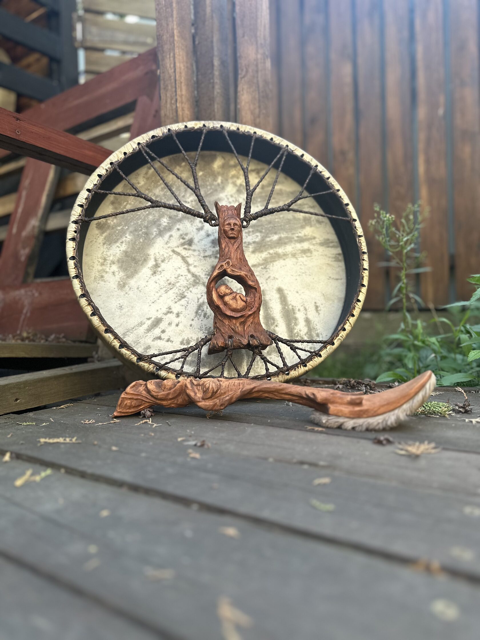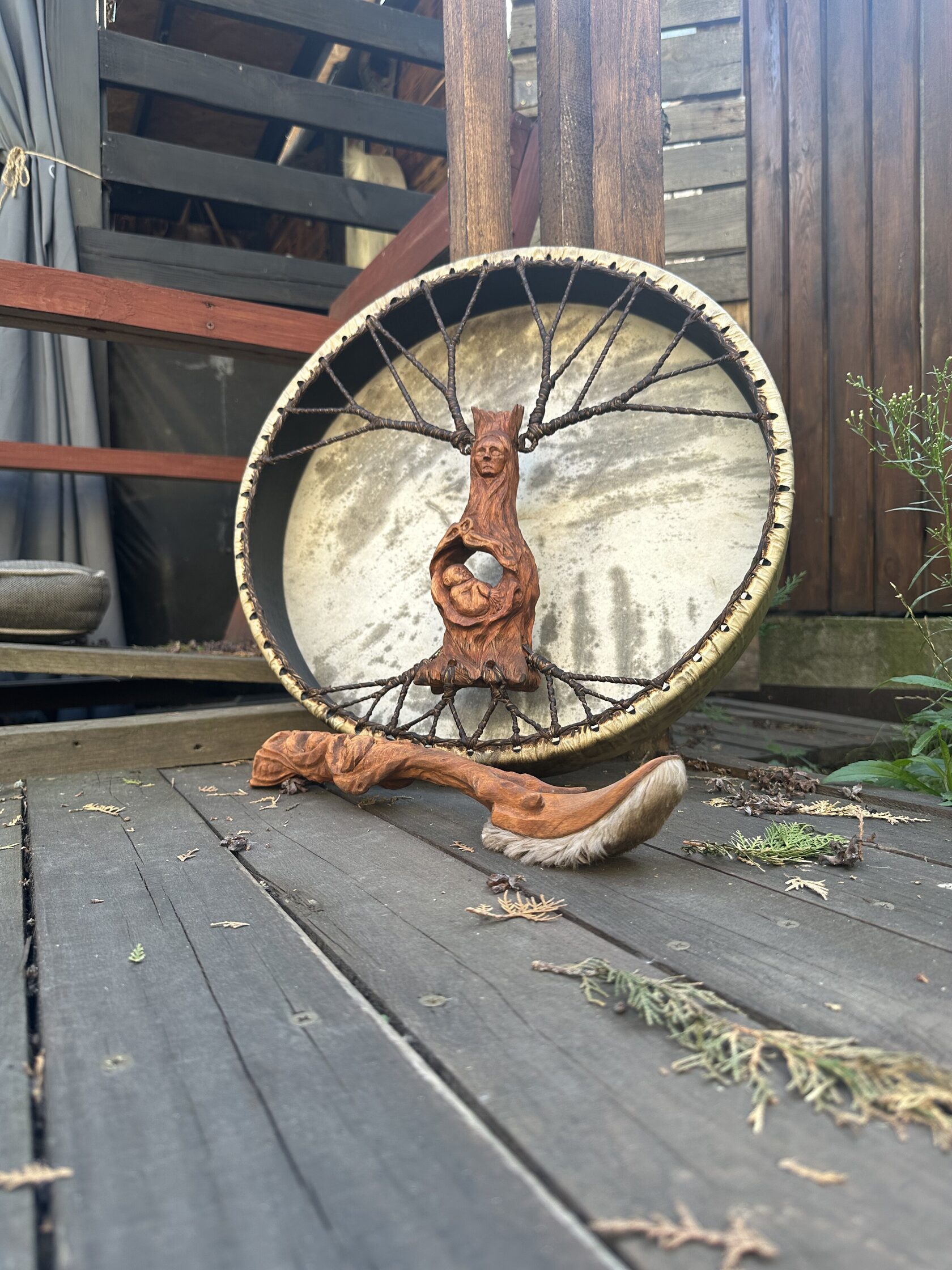 | Про мене Привіт. Мене звати Макс, і моя історія з бубнами почалася у 2015 році. Тоді я вперше вирішив зробити бубон для себе — так з’явилося хобі, яке з часом перетворилося на справу життя. У 2018 році я зробив сміливий вибір: після 18 років у великій компанії залишив офісну роботу, щоб присвятити себе ремеслу. Відтоді створення шаманських бубнів стало моєю професією та покликанням. За понад 10 років я виготовив більше двох тисяч бубнів, і сьогодні вони звучать у багатьох країнах світу. Завдяки багаторічній практиці та наполегливій роботі мені вдалося виробити власний підхід до створення інструментів. Саме тому кожен бубон має глибокий і насичений низький звук, який відчувається всім тілом. Це результат досвіду, який приходить лише з роками кропіткої праці. Окрему увагу я приділяю рукояткам: від символічних «Дерев життя» до складних різьблених фігур, створених вручну. Кожна рукоятка несе власний образ і сенс, роблячи інструмент неповторним. Я працюю лише з натуральними матеріалами: козячою шкірою для мембран, ясеневим деревом для ободів, сосною та вільхою для рукояток і колотушок. У декорі використовую метал, каміння, бісер, льон та інші природні матеріали, щоб надати кожному виробу завершеного образу й особливої сили. Кожен виріб народжується в моїй майстерні виключно вручну, має свій характер і допомагає власнику відкрити внутрішній ритм та силу. |
